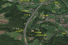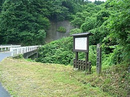 接待館史跡から西へ1.5kmほどで東北道の下を抜けて月山(三峯)神社前を左折し東北道沿いの細道を600mで橋の横に案内板が立っている。