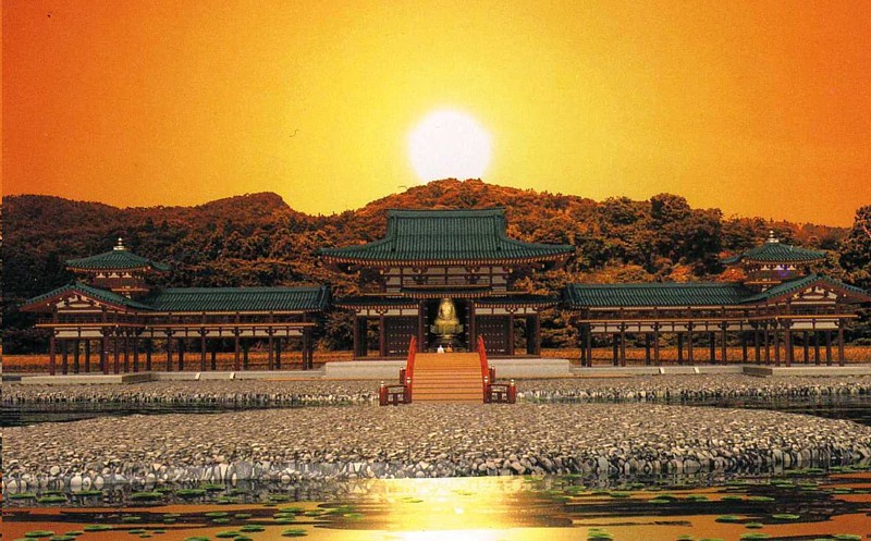 金鶏山の夕陽を背にしたC.G(仙台市博物館蔵書)。春秋の彼岸には橋と堂を結ぶ延長線に陽が没したと伝わる。