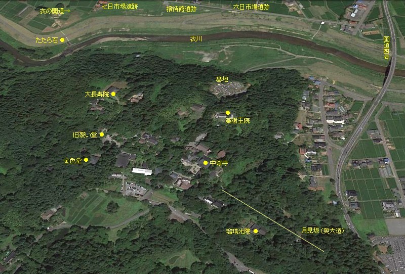 奥大道は月見坂→ 中尊寺本堂→ 金色堂→ 大長寿院を経て衣川を渡り、衣の関道を通って接待館に至る。