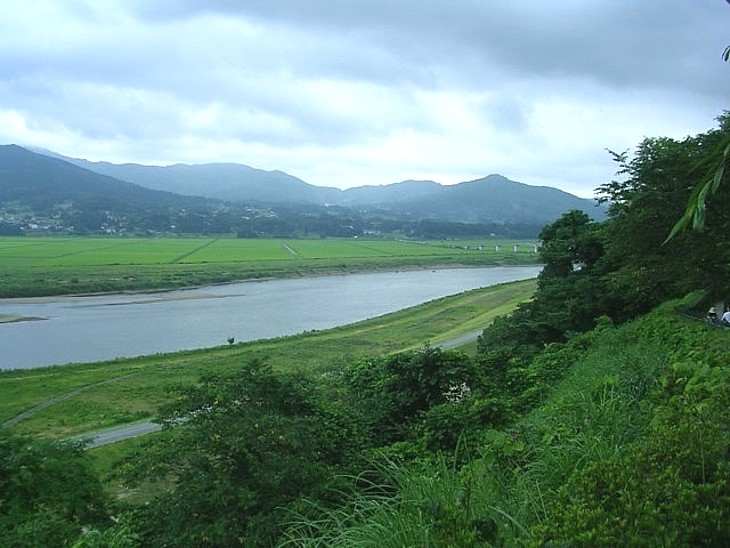 高館からの眺めは穏やかで美しい。右手には古代の「たたら跡」が残る舞草神社の観音山。