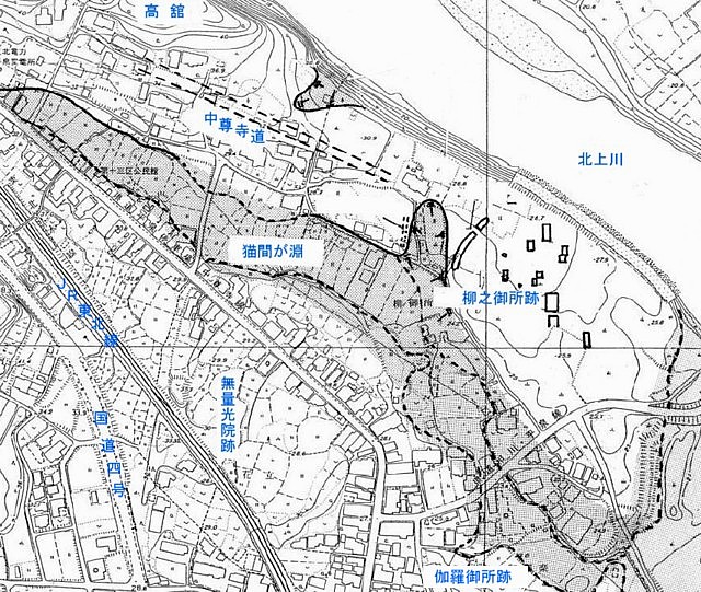 発掘調査の図面。猫間が淵は北上川の古流路で、浅い沼または湿地帯だったらしい。