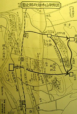 左:山木館攻略図 (昭和初期に地元の教師らが製作したもの) 画像をクリック→拡大表示