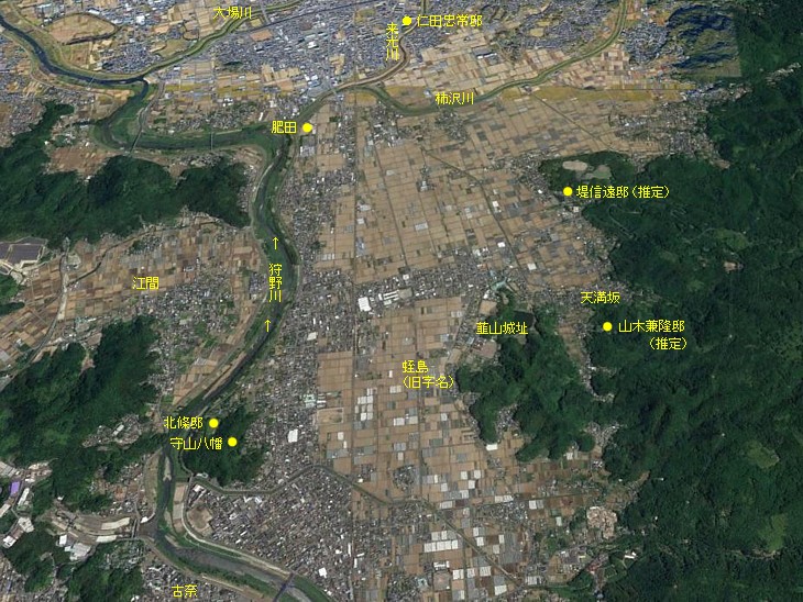 地図)と伝わっており、近くには北屋敷・南屋敷・下屋敷・馬場・古屋敷などの地名が残っている。肥田一族が頼朝挙兵にどう関わったのかは不明。