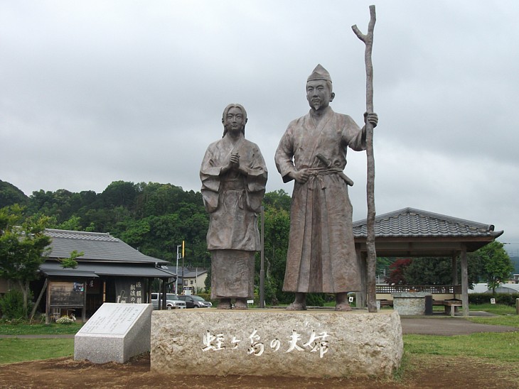 発掘調査の結果は蛭ヶ小島の周辺からは人家の痕跡は出土せず、頼朝と政子の像が虚しく佇むのみ。
