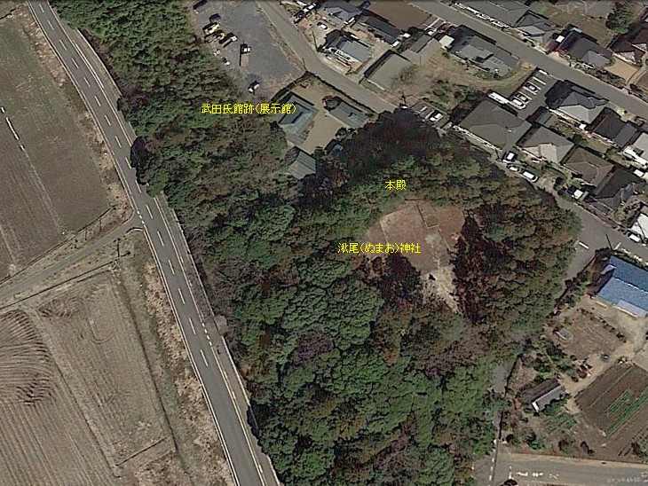 中央の四角が武田氏館、右側の森が湫尾神社、右隅の上下方向にJR常磐線が走る。