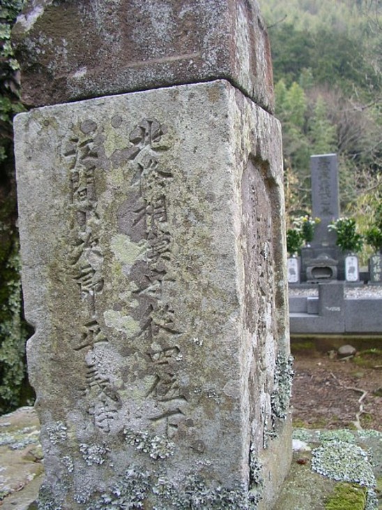 義時墓石の左側面、文字部分の拡大。 北条相模守従四位下 江間小次郎平義時 とある。