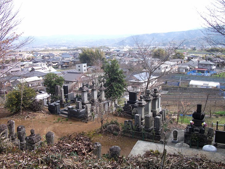 墓所から東、狩野川越しに韮山と函南の方向を。中央の山裾を越えた辺りが毘沙門堂と国清寺となる