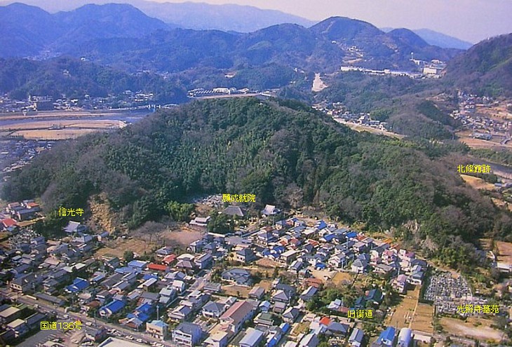 東からの航空写真。中央に願成就院、左の山裾に信光寺と更に先に真珠院、右隅に光照寺墓地が見える。