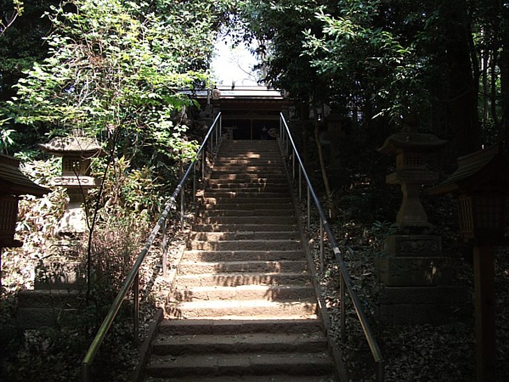 石段から一段高い本殿へ。周辺は大部分が平地なので円墳を神社にした可能性もありそうだ。