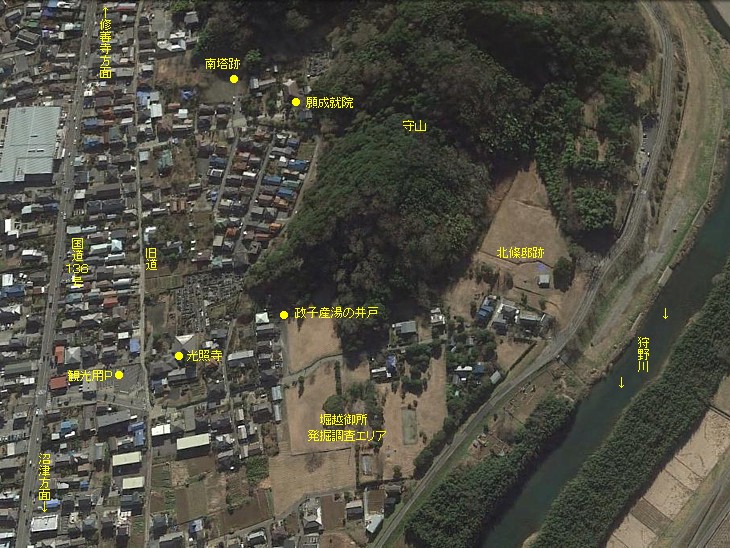 北側から見た堀越御所周辺の鳥瞰。旧国道に沿って古い堀があった、との説もあるのが面白い。