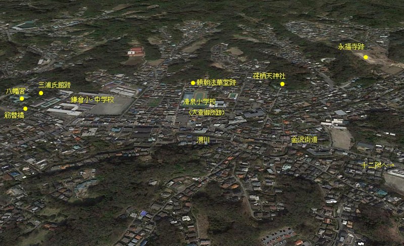 宝治合戦の舞台となった三浦邸から永福寺にかけての鳥瞰。