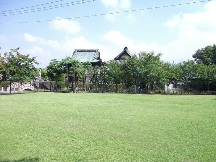 遊亀公園の芝生越しに一蓮寺本堂を。裏手(北側)に一蓮寺幼稚園を併設している。