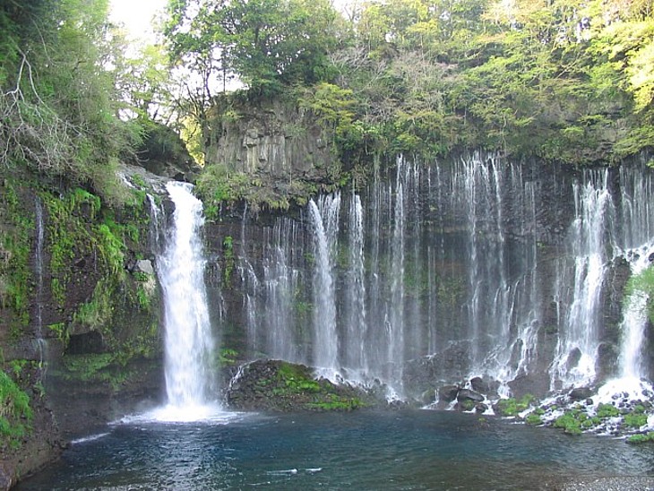 国の天然記念物、白糸の滝。左の流れ以外は全て富士山の伏流水、溶岩断層の割れ目から流れ落ちている。