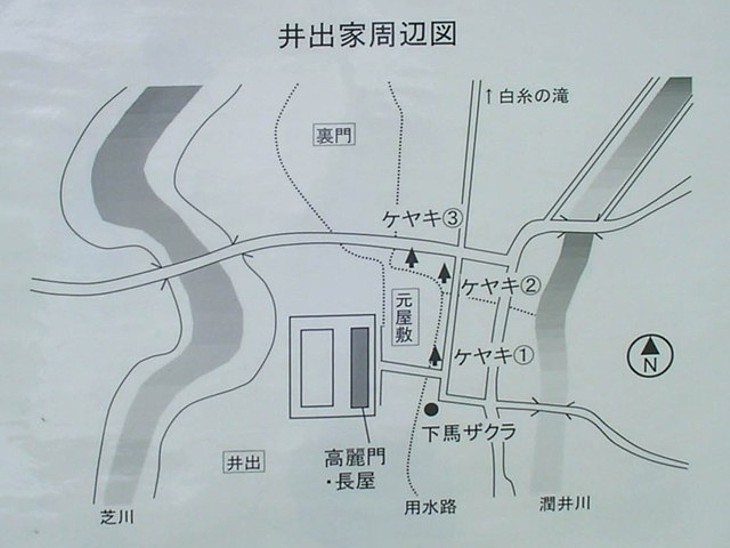 頼朝は下馬桜の枝に乗馬を繋いだ。三本のケヤキに幕を張り奥に宿舎を設けたと伝わる。