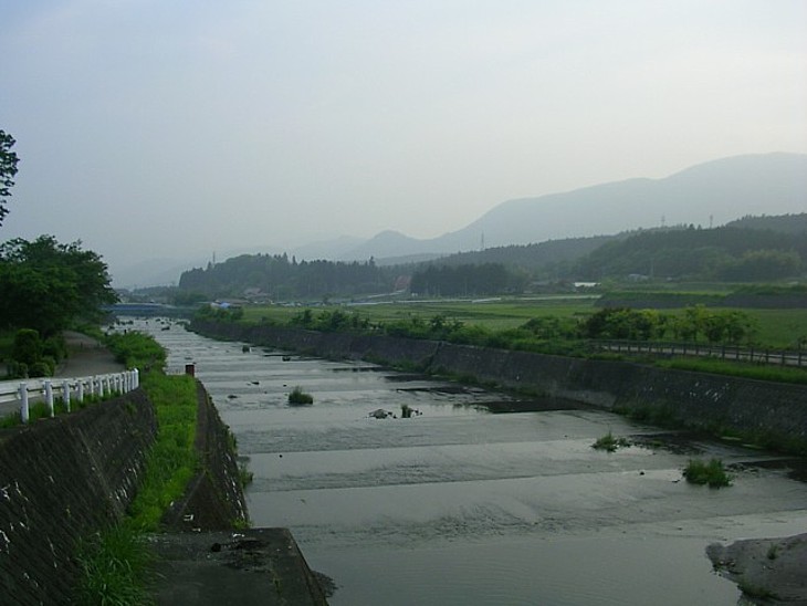 潤井川の上流(音止めの滝方向)から下流の頼朝狩宿跡(正面左側の森)を見る。
