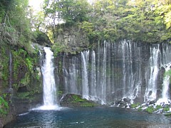 左: 最近は人気が落ち目で観光客の減少が顕著な白糸の滝は日本の滝百選の一つで国の天然記念物。川水の滝ではなく富士山の伏流水が溶岩断層