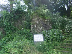 右: 祐経の宿舎に討ち入る前に兄弟が身を潜めて手順を密談した「曽我の隠れ岩」。狩宿跡に残る祐経の墓までの距離は約150m。