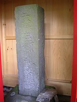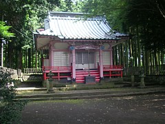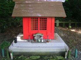 中: 何故か朱色に塗られた覆屋の中に祐経の墓石が納められている。粗末ではあるが風化を避けるためには欠かせない設備だろう。
