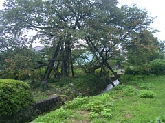 左: 狩宿の跡。背後の樹林の中にケヤキBが残り、背後は深い崖が芝川に落ち込む。前面は潤井川が流れ、要害の体をなしている。