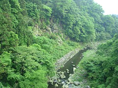 右: 上流の音止めの滝近くから下流の狩宿(正面左側の森)を。狩宿は芝川と潤井川に挟まれた200m四方ほどの平地である。土地の傾斜が強いため