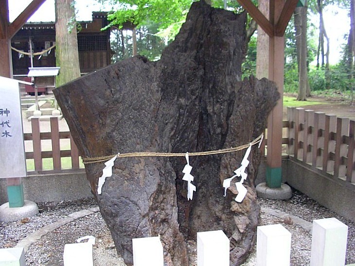 義貞が旗を立てたと伝わる椚(クヌギ)の古木。枯れ残った根元を樹脂で固め修復・保存している。