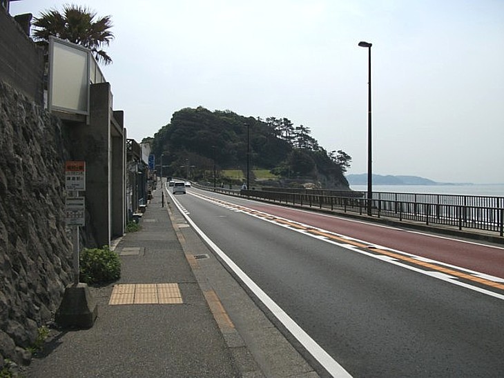 江ノ電近くの国道から稲村ヶ崎を撮影。遊歩道が由比ヶ浜から江の島の先まで伸びる、絶好の散歩コース。