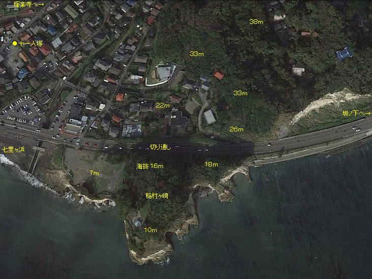 昭和三年の切通し完成までは霊山山(霊仙山)と稲村ヶ崎は約20mの高さで繋がり交通を遮断していた。