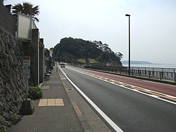 左: 江ノ電の稲村ヶ崎駅から真っ直ぐ下った国道から撮影。海沿いの遊歩道が由比ヶ浜から江の島の先まで伸びる絶好の散歩コースだ。
