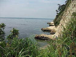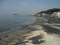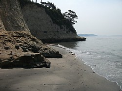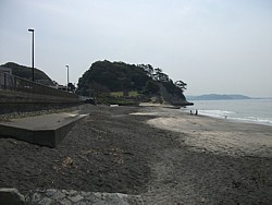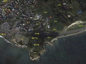 中: これは由比ヶ浜側(坂ノ下)からの画像で、海岸の形状は七里ヶ浜側と変わらない。新田義貞渡渉伝説に関する主張は実に百花繚乱で、目糞が鼻糞を