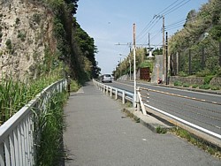 右: 由比ヶ浜側から切通しを撮影。極楽寺駅から稲村ヶ崎駅に下る道路側も山の傾斜はかなり急だが、海側は完全な「崖」になっている。