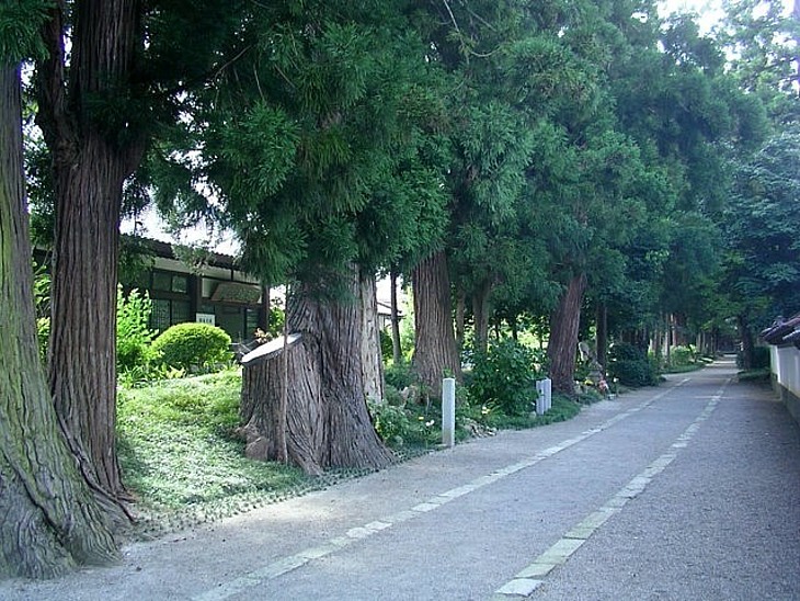薬師堂参道に続く見事な杉並木。本堂を素通りした芭蕉と曽良が参詣した道である。