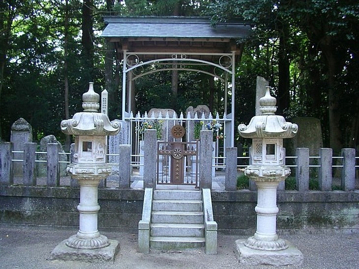 薬師堂裏側の佐藤基治と乙和御前の廟所。五輪塔ではなく奥州型板碑(板石塔婆)である。