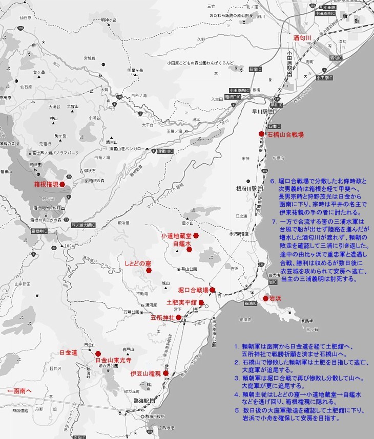 最初の本格的な合戦は暗夜の石橋山、その後の数日は平治の乱と共に頼朝の生涯で最大の危機だった。