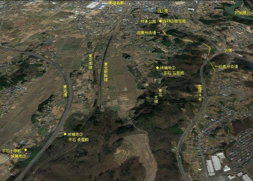 旧奥州街道が通っていた南福島・石那坂古戦場推定地。平石から羽山岳まで台地が続く要害ではある。