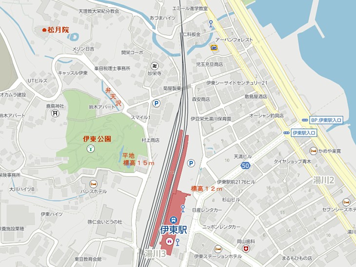 暗渠となった弁天沢沿いに、伊東公園の平地から伊東駅の周辺にあった天神畑。北の小御所の痕跡か?