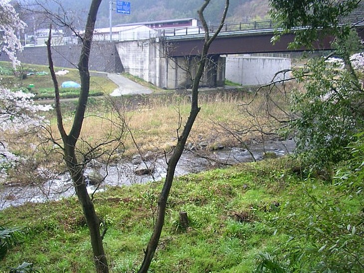 本堂の裏手を流れる冷川。300m下流(左手)で大見川と合流し、天然の壕を形成する。