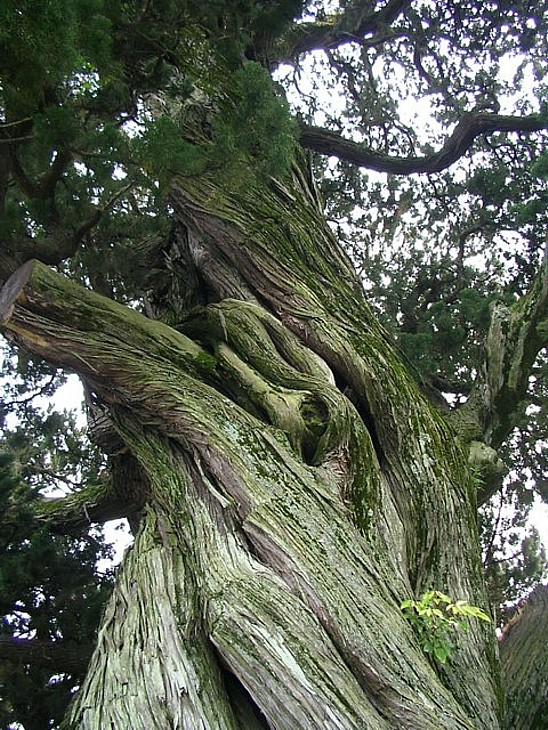 樹勢の衰えも見られず、一部欠損はあるが見事に捩れて渦を巻く幹の姿が素晴らしい。