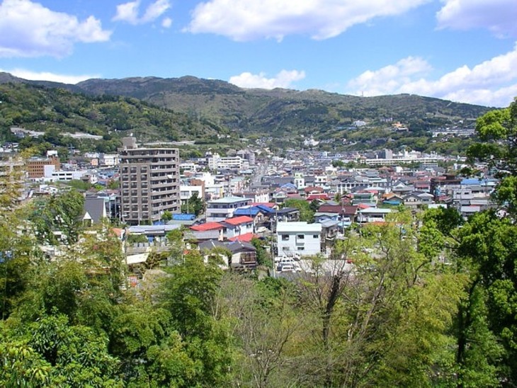 海岸近くから湯河原の町並みを。左が城山で正面が幕山、星ヶ山の頂上が少し見える。
