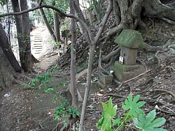 右: 少し離れたもう一つの石祠(狐さんがいるので稲荷に間違いない)から宮姫祠の方向を。個人的には、どちらも古い山神の祠だろうと思うけど。