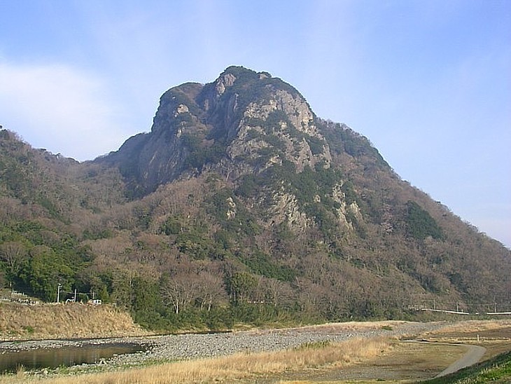 南東の狩野川堤防から見た城山。手前には修禅寺道路(伊豆中央道)が走っている。
