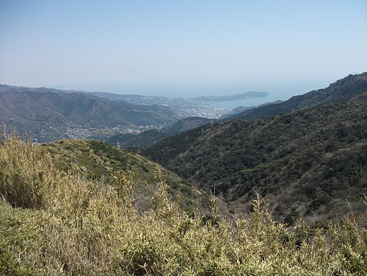 湯河原の市街地が一望できる。右側の山の向こうが伊豆山神社、正面には真鶴半島。