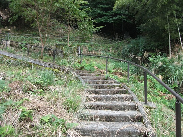 荒れかけた参道を50mほど進んだカーブの突き当りに見える石碑付近に頼家の庵があったと伝わる。