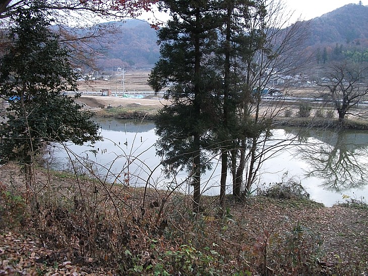 樺崎八幡宮から見下ろす庭園(苑池)跡。建物跡は整備が終わり、池周辺の整備が始まる。