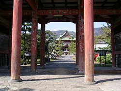 右: 山門の柱を通して金堂を見る。信濃善光寺と違って土産物店の喧騒とは無縁だし、休日でも混雑なしに散策できる。時間が許せばヤマトタケル伝説の残る