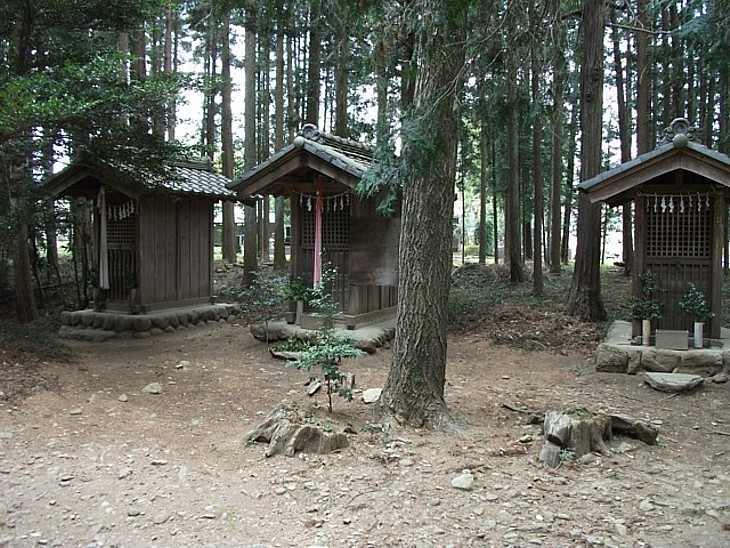 裏手には境内社が三棟、石段前の左右に各一棟。植樹した樹齢50年前後の杉林が続く。