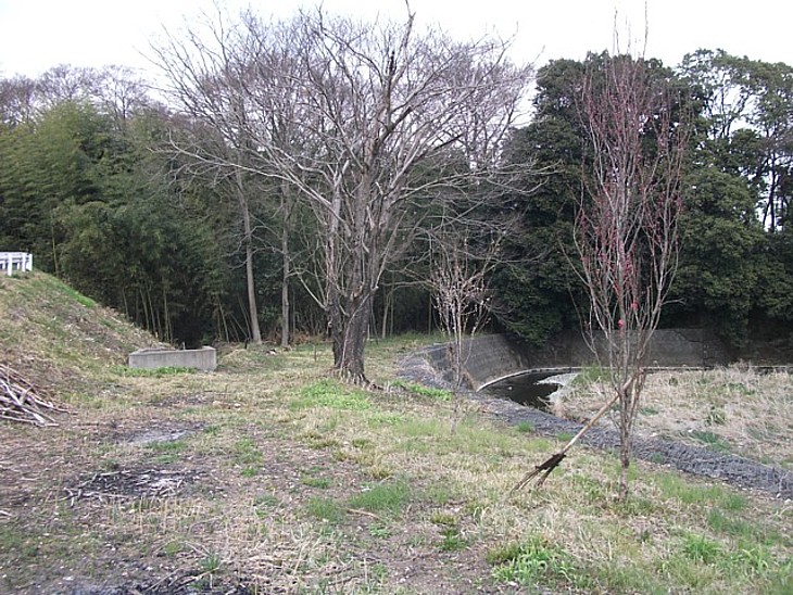 都幾川から下屋敷跡を撮影。川筋は直角に右折し、500m下流で再び直角に左折する。
