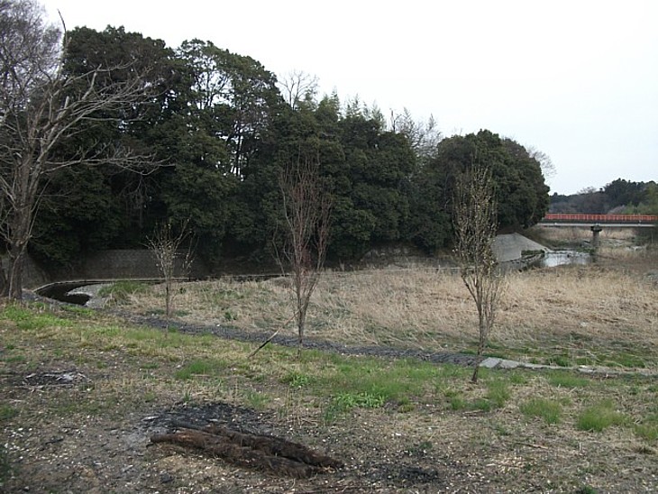 左岸の土手から班渓寺方向を。都幾川を横切る赤い欄干は山門前の道に架かる班渓寺橋。