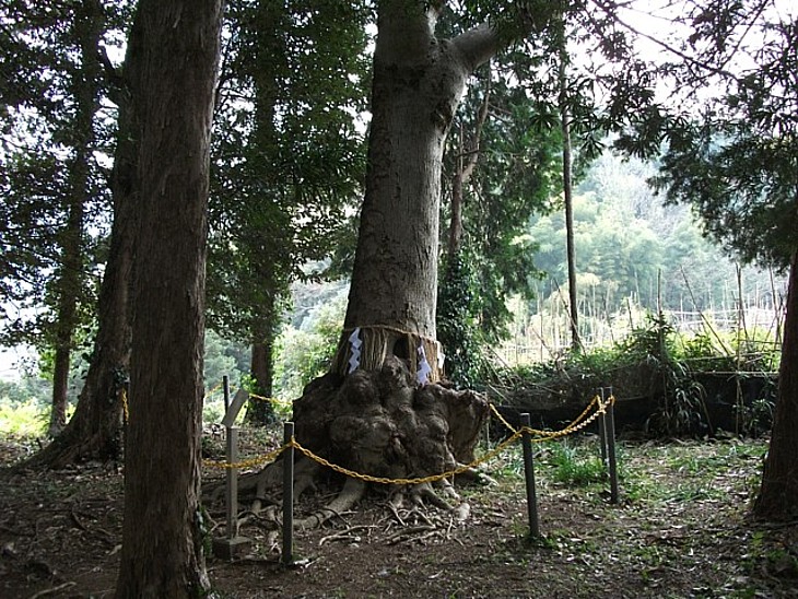 境内の裏手、注連縄が架かるホウノキは御神木で、伊東市の名木に登録されている。