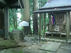 中: 兜杉の右が義家と義光を祀る兜八幡神社。義家は凱旋する際に杉を植えると共に愛用の兜を埋めてその上に石を置いた、と伝わっている。