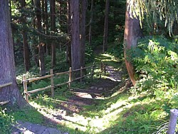 右: 本丸跡東側の遊歩道を約100m下って籠城の水源である金洗い清水へ。「奥州後三年記」に拠れば義家軍は9月に金澤の柵を包囲して